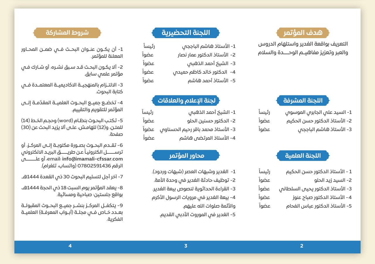 مركز الإمام أمير المؤمنين ( عليه السلام ) للدراسات والبحوث التخصصية في النجف الأشرف يعلن عن منهاج ( مؤتمر الغدير العلمي للإبداع الفكري الثاني ) ومحاوره للتفضل بالتواصل : info@imamali-cfssar.com او بالتواصل عبر الرقم التالي 07802591436 الأخبار في مارس 29, 2023 709 شارك 709 شارك