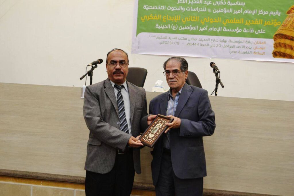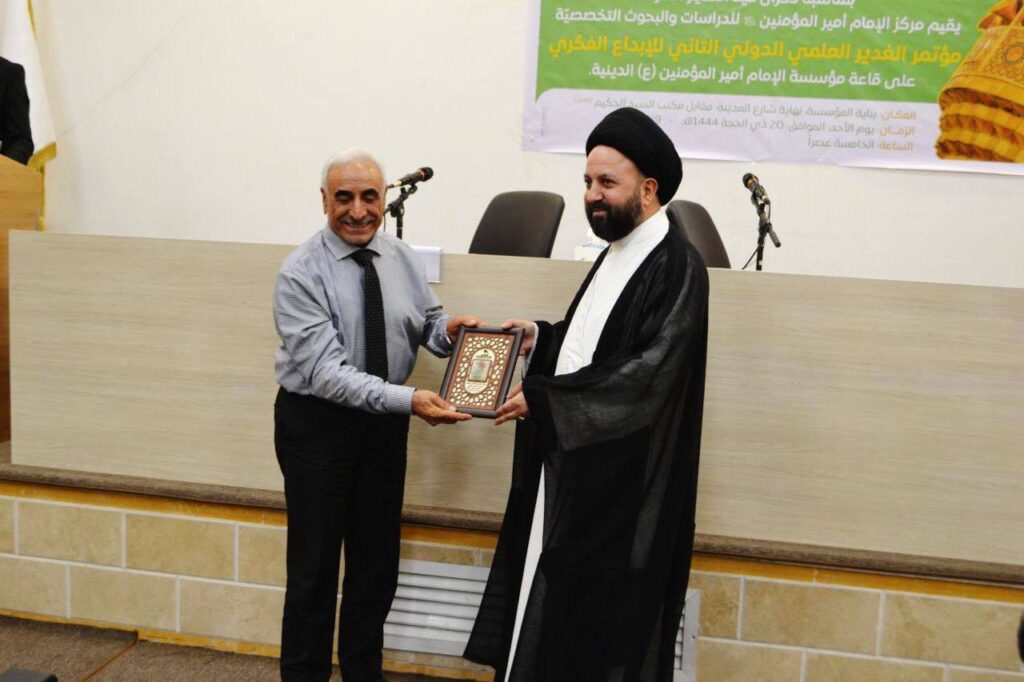 افتتحت يوم الاحد 20 ذي الحجة 1444ه الموافق 9/ 7 / 2023م في الساعة الخامسة عصرا فعاليات مؤتمر الغدير العلمي الثاني للإبداع الفكري الذي أقامه مركز الامام أمير المؤمنين (عليه السلام) للدراسات والبحوث التخصصية ، وابتدأ المؤتمر بقراءة آيات من الذكر الحكيم للقارئ الشيخ قاسم الجبوري ، ثم ألقى سماحة السيد مرتضى الشيرازي (دام ظله) كلمة موجزة أوضح فيها أهمية حادثة الغدير عند المسلمين جميعا والابعاد الحقيقية ليوم الغدير من الناحية العقائدية والسياسية لان الحادثة قد رسمت طريقا واضحا للمسلمين ، بعدها ألقى أ.د. حسن عيسى الحكيم رئيس المجلس العلمي الاستشاري في المركز كلمة المركز حيث بين أهمية عيد الغدير وكيف حصل الانقلاب عليه ، ثم بين أهداف المركز وتوجهاته وتطلعاته في نشر فكر الامام أمير المؤمنين عليه السلام ، ثم أنشد الشيخ حسنين قفطان قصيدة رائعة في المناسبة ، وبعد القصيدة تم عرض فلم قصير عن المؤتمر الاول وأهم نشاطات المركز ، بعدها بدأت أعمال المؤتمر ، وتوزعت أعماله بين قاعتين الكبرى والصغرى ، وبدأت جلسات البحث في القاعة الكبرى التي كانت برئاسة أ.د. حاكم الكريطي ، والسيد نوفل الحمامي مقررا ، حيث تمت مناقشة خمسة بحوث من أصل ثمانية بحوث ، وجرت في القاعة الصغرى أعمال الجلسة الاخرى وفي نفس الوقت ، وكانت برئاسة سماحة السيد زيد الحلو والدكتور خالد حميدي مقررا ، وتمت مناقشة خمسة بحوث من أصل سبعة بحوث ، وبعد الانتهاء من مناقشة البحوث ،قرأ أ.د. عمار نصار التوصيات التي خلص لها المؤتمر وهي كالاتي : اولا: أثبتت الوقائع التاريخية والأدبية حادثة الغدير وولاية أمير المؤمنين عليه السلام الأمر الذي يجعلنا أمام هذه الحقيقة التي لا مراء فيها مما يحتم علينا إيصاء الجهات الفاعلة في وضع مناهج التربية والتعليم بلزوم إدخال قضية الغدير فيها ودراستها. ثانيا: الاستمرار بعقد الندوات والمؤتمرات النوعية حول مناسبة غدير خم لتعريف الأمة بأهميتها وللتذكير بواقع الظلم العظيم الذي لحقها وحجم التضليل الذي نالها. ثالثا: بيان أهمية تمثيل حادثة الغدير وبعثها من جديد بمختلف الفنون الدرامية والتشكيلية واستعمال لغة العصر في مخاطبة أجيال العالم المعاصر، وأن لا يقتصر إحياء المناسبة بالمؤتمرات العلمية فحسب على أهميتها. رابعا: العمل على توثيق الأعمال العلمية والأدبية للمشاركين في المؤتمرات والندوات المعنية في المناسبة العلوية العظيمة من خلال نشرها بشكل منهجي في مجلات مركز الإمام أمير المؤمنين عليه السلام كمجلة أبواب المعرفة أو طباعتها في مجلد خاص بوقائع المؤتمر. وفي نهاية المؤتمر تم توزيع دروع المؤتمر على الباحثين المشاركين من قبل المشرف العام للمركز سماحة السيد علي الجابري دام توفيقه، ورئيس المجلس العلمي الاستشاري الدكتور حسن الحكيم ، بعدها تم توزيع درع المؤتمر على أعضاء اللجنة العلمية للمؤتمر من قبل المشرف العام للمركز ، ثم وزع مدير المركز الاستاذ هاشم الباججي درع المؤتمر على أعضاء اللجنة التحضيرية والاعلامية ، ومن الجدير بالذكر الى أن هذه البحوث ستجمع وتطبع في عدد خاص من مجلة أبواب المعرفة البحثية التي يصدرها المركز بمناسبة عيد الغدير الاغر.