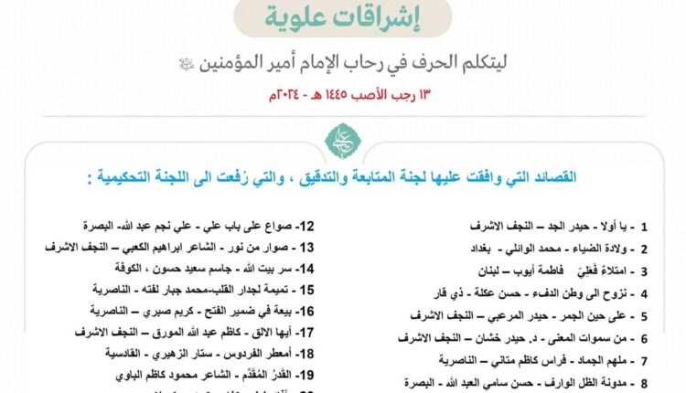 مركز الإمام أمير المؤمنين ( عليه السلام ) للدراسات والبحوث التخصصية في النجف الأشرف يعلن عن القصائد الشعرية المقبولة، والتي ستدخل على المنافسة في المسابقة الشعرية التي يقيمها المركز في مهرجان الشعر العمودي الثالث في ذكرى ولادة الإمام أمير المؤمنين ( سلام الله عليه ).