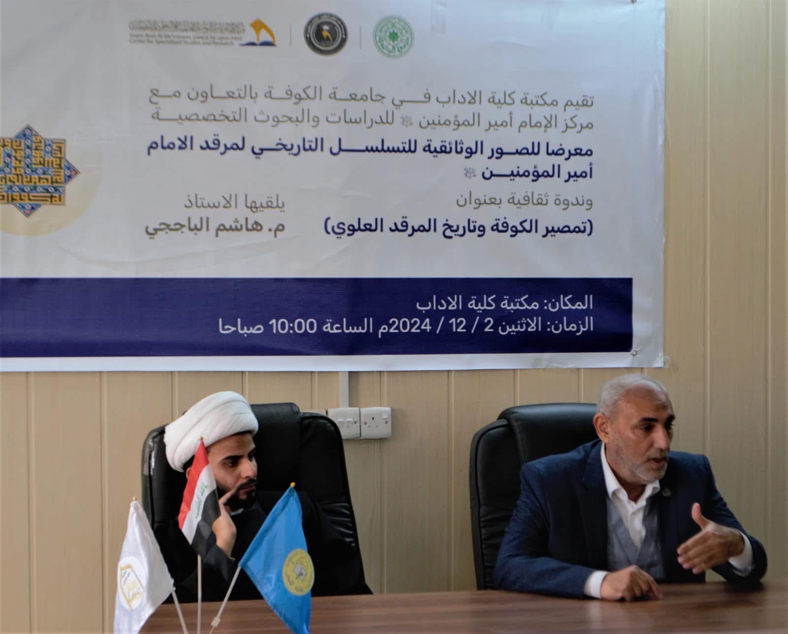 وندوة ثقافية بعنوان [ تمصير الكوفة وتاريخ المرقد العلوي ] ألقاها مدير المركز الأستاذ م. هاشم الباججي ، وذلك ضمن التعاون الثقافي والفكري بين كلية الآداب ومركز الإمام أمير المؤمنين ( عليه السلام ) للدراسات والبحوث التخصصية في النجف الاشرف ،