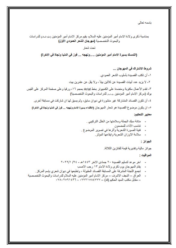 مهرجان الشعر العمودي الاول في شهر رجب 1444هـ – 2022م الأخبارالمؤتمرات والندوات آخر تحديث يناير 12, 2023 714 شارك 714 شارك